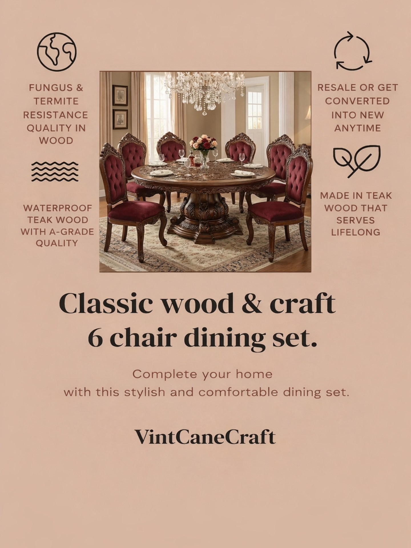 The Classic Wood & Craft – Six Chair Dining Set by VintCaneCraft is designed to combine heritage craftsmanship with modern durability. Made from A-grade solid teak wood, this dining set reflects elegance, strength, and sophistication.